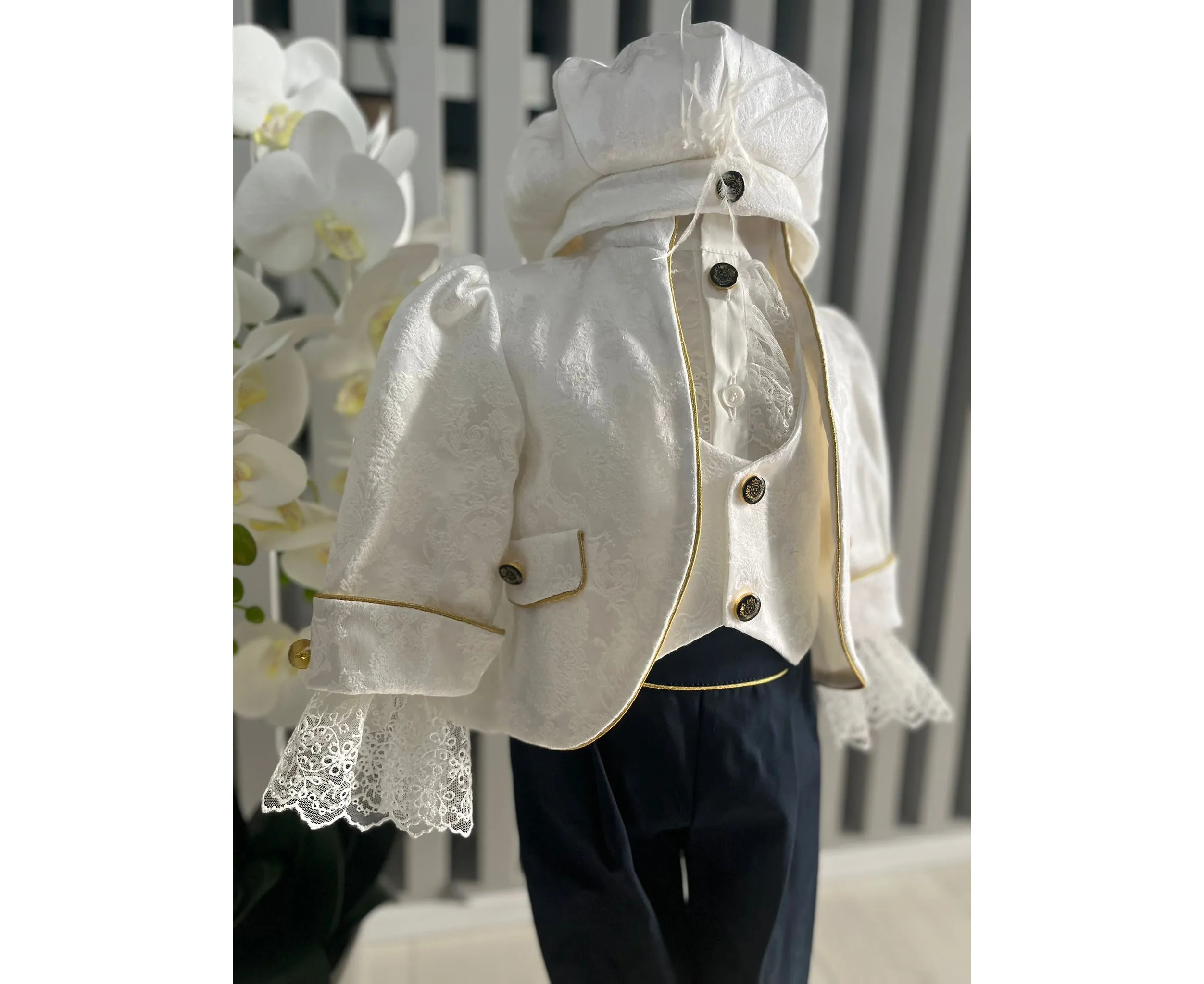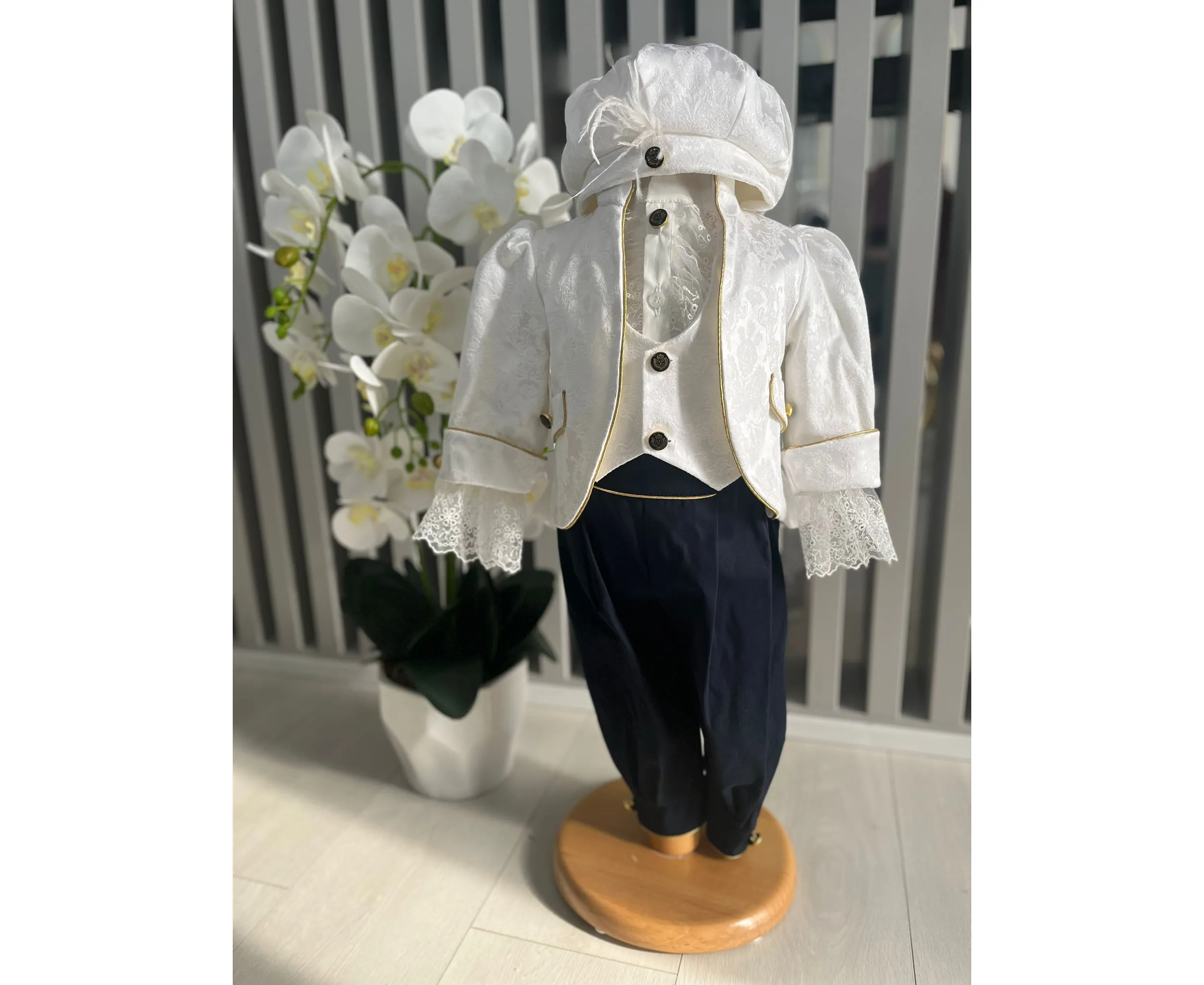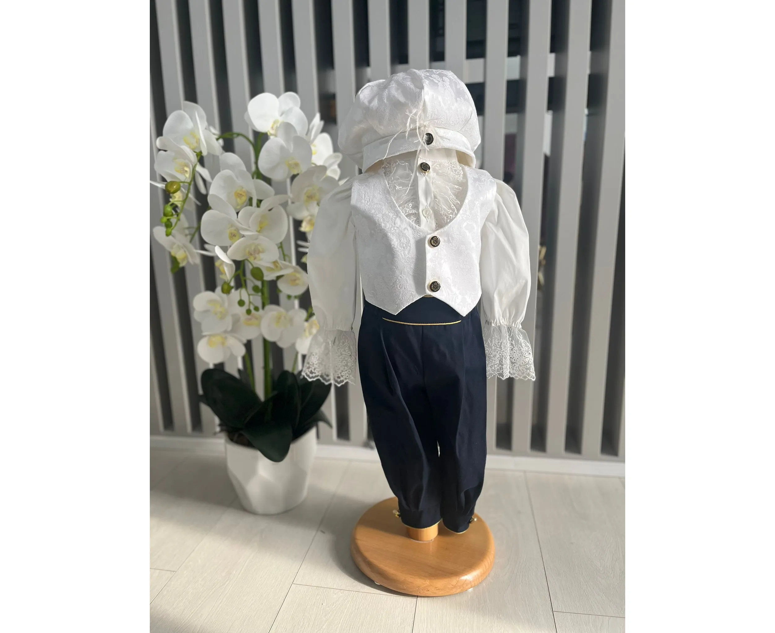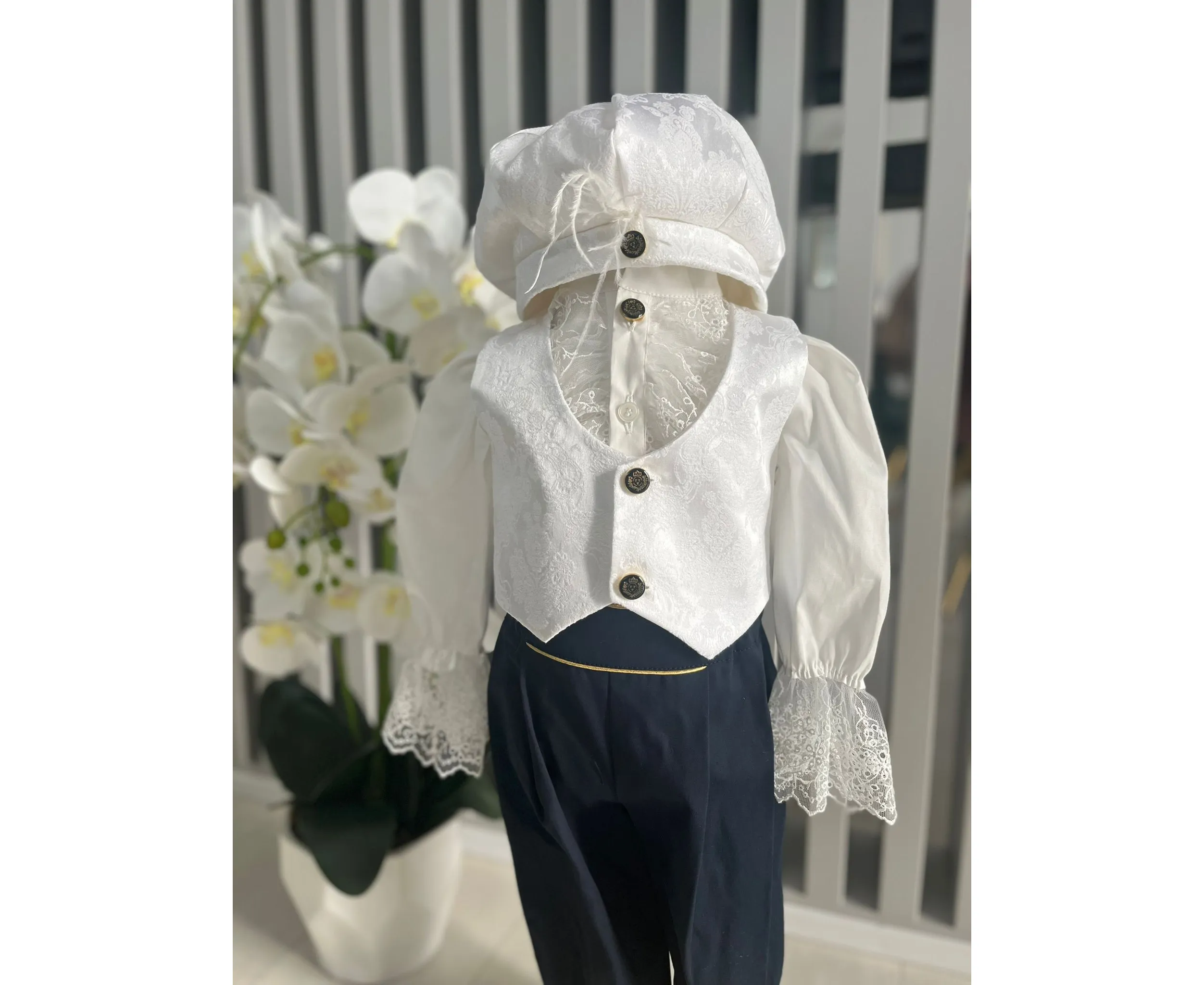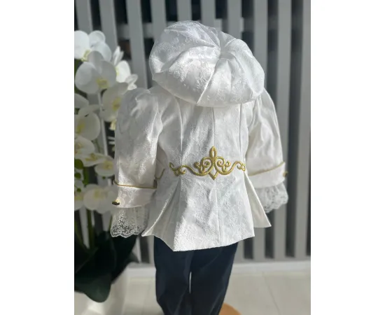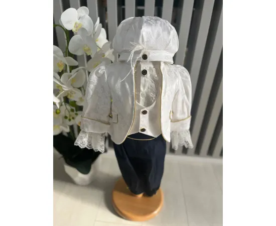 Costumul de botez pentru băieți este realizat cu grijă din materiale de calitate superioară, moi și delicate cu pielea sensibilă a bebelușului. Designul elegant îmbină rafinamentul clasic cu confortul absolut, fiind ideal pentru un eveniment special precum botezul