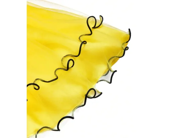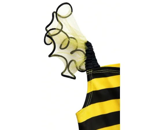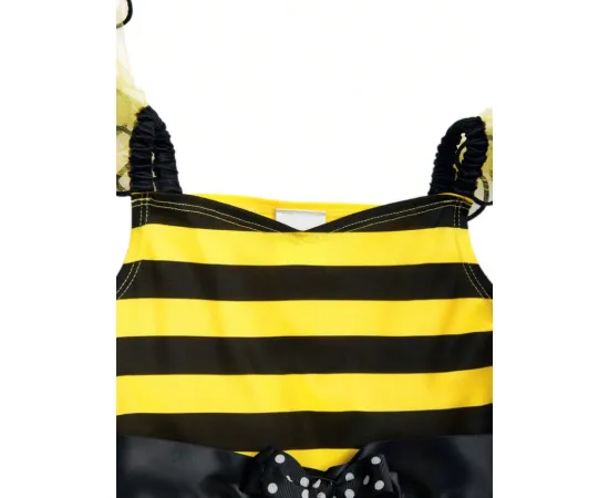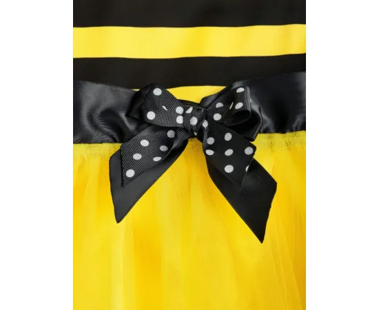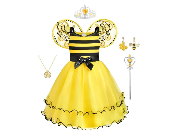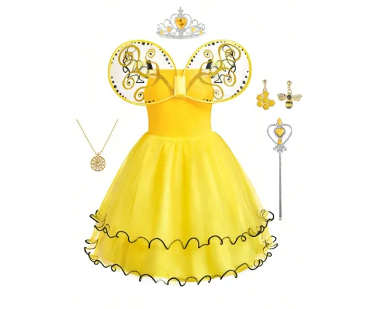 Fiecare fetiță merită să strălucească, iar această rochie adorabilă o transformă instant într-o albinuță jucăușă și plină de farmec! Cu un design vesel în galben și negru, rochia este completată de un set fermecător de accesorii: cercei clip-on, colier sclipitor, diademă cu antenuțe și baghetă magică.