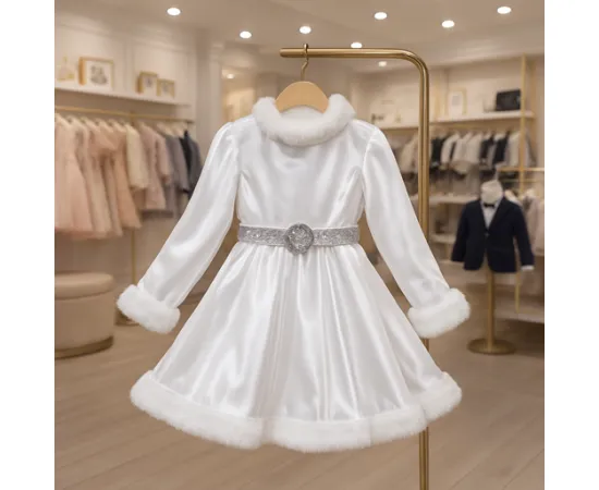 Costum Serbare Fete – Fulg de Nea din Satin Alb cu Blăniță