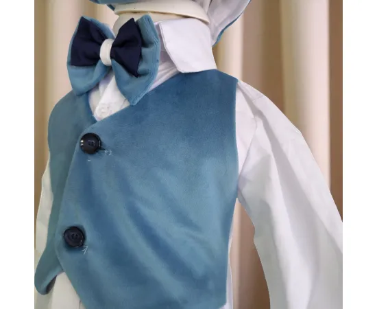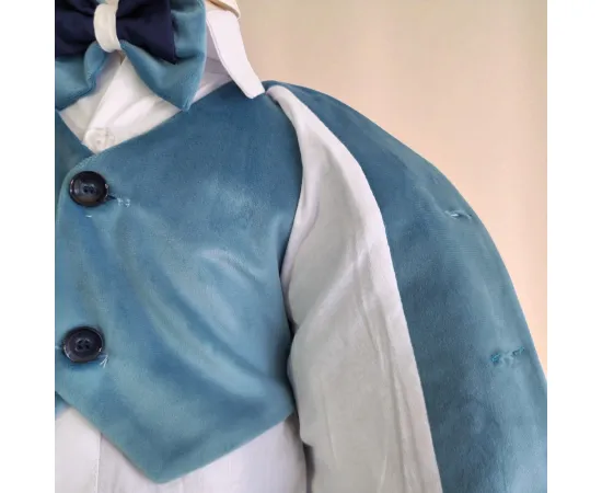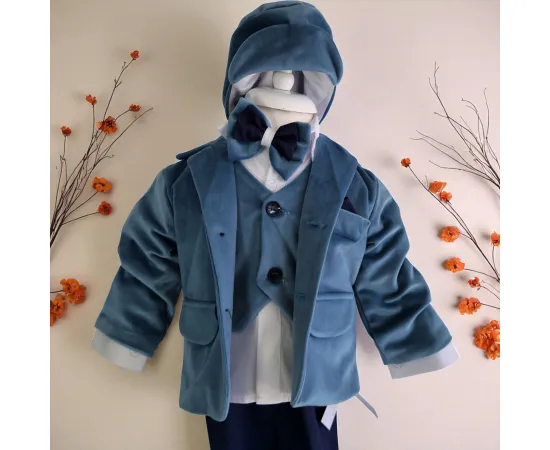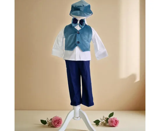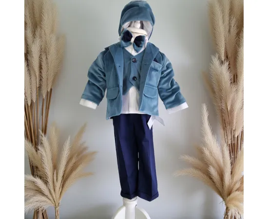 Costumaș botez „Micul Aristocrat” – o ținută rafinată, realizată din catifea fină, special creată pentru a oferi micuțului un aer nobil și distins în ziua botezului. Designul elegant este completat de detalii atent lucrate și de accesorii care transformă setul într-o apariție memorabilă.