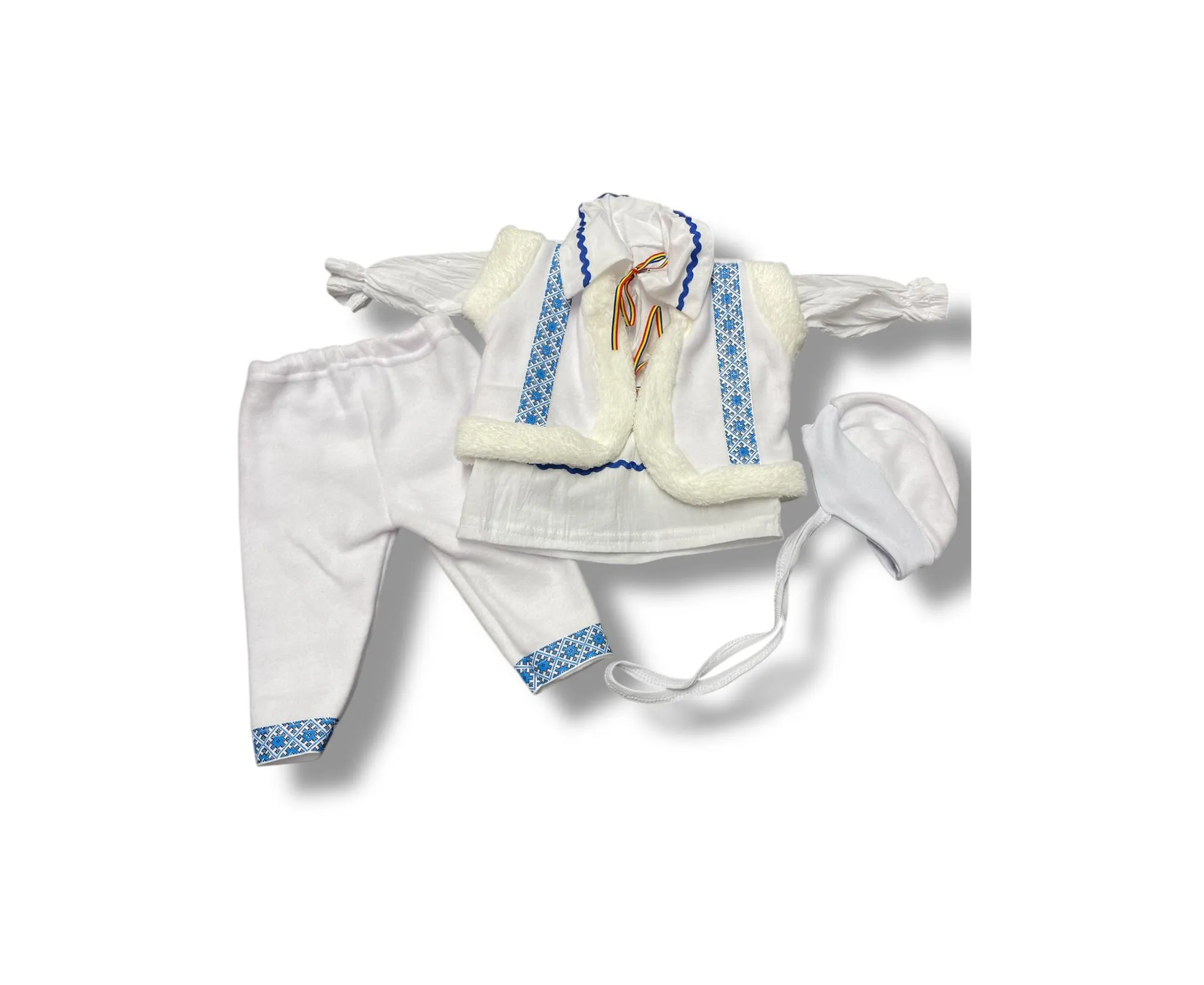 Costumul tradițional pentru băieți, în nuanțe de albastru, cuprinde o cămașă albă din pânză, brodată la guler și mâneci cu motive albastre. Ținuta poate fi completată de o vestă decorată cu modele tradiționale și de opinci sau pantofi simpli. Combinația de alb și albastru sugerează puritate, curaj și eleganță, oferind băieților un aspect deosebit și autentic.