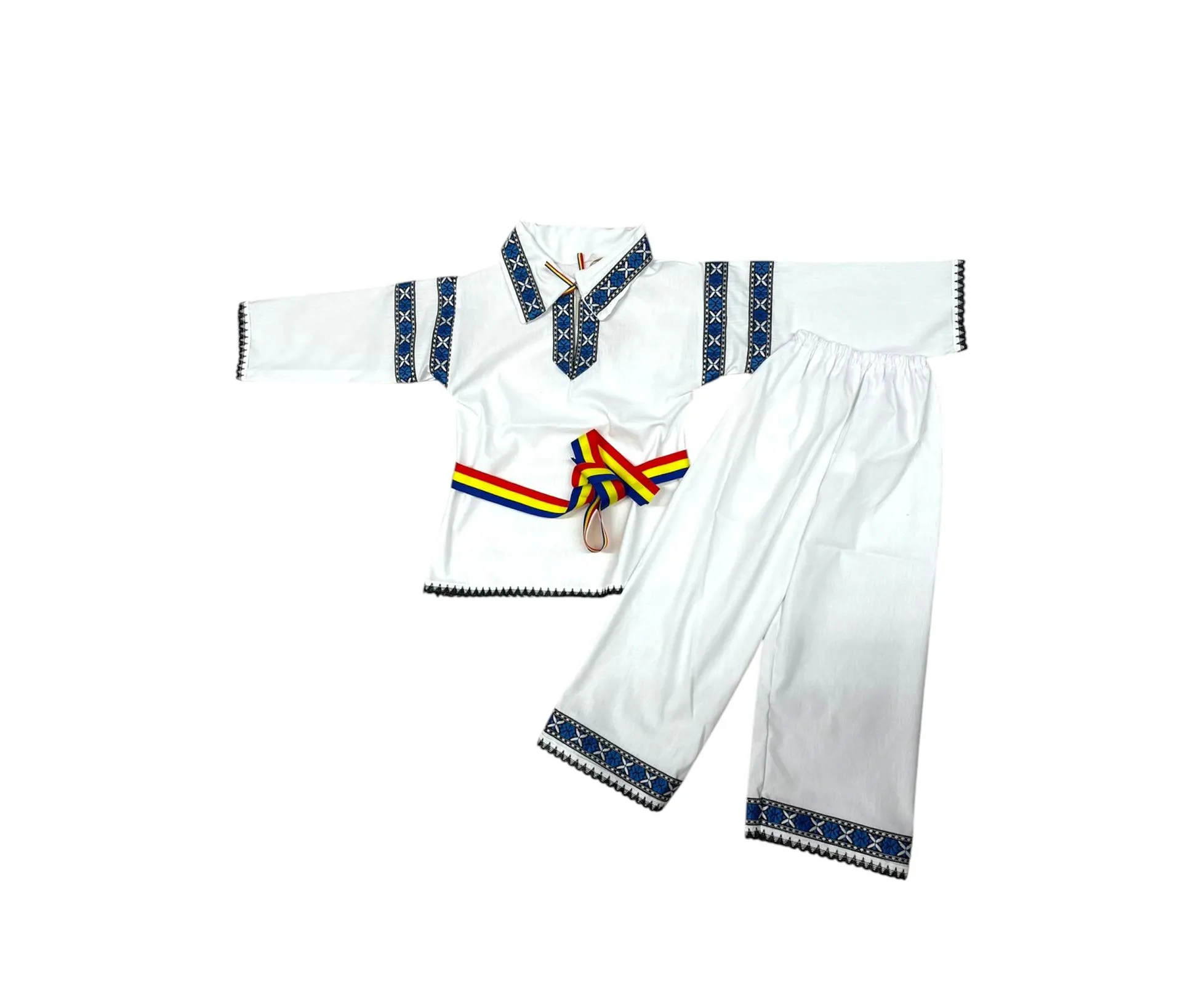 Acest costum tradițional pentru băieți aduce la viață frumusețea și autenticitatea portului popular românesc, fiind ideal pentru sărbători, evenimente culturale sau spectacole școlare. Costumul este confecționat din materiale confortabile, ușor de purtat și rezistente, potrivite pentru pielea delicată a copiilor.