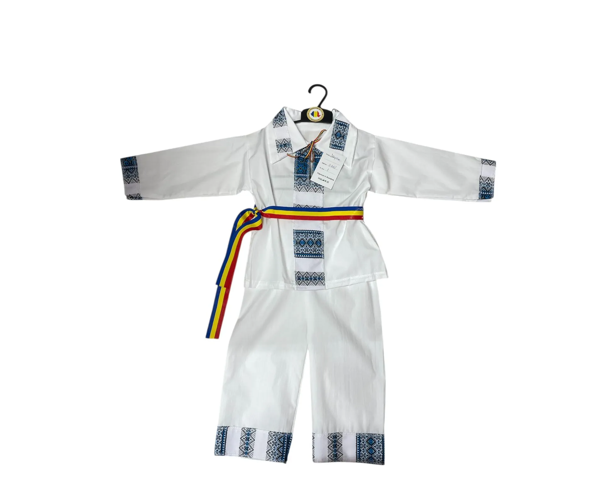 Acest costum tradițional pentru băieți aduce la viață frumusețea și autenticitatea portului popular românesc, fiind ideal pentru sărbători, evenimente culturale sau spectacole școlare. Costumul este confecționat din materiale confortabile, ușor de purtat și rezistente, potrivite pentru pielea delicată a copiilor.