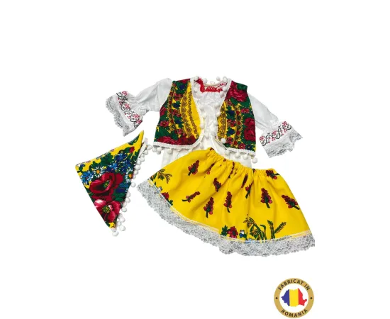 Un port popular plin de lumină și veselie, creat special pentru micuțele care vor să strălucească! Costumul este compus din cămașă albă cu broderii delicate, o vestuță galbenă cu motive tradiționale, o fustiță jucăușă și un batic asortat, toate îmbinate armonios într-un ansamblu autentic.
