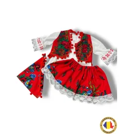 Un ansamblu fermecător care aduce frumusețea tradițiilor românești mai aproape de cei mici! Costumul este alcătuit din cămașă albă delicată, cu broderii fine, o vestuță roșie cu motive populare, o fustiță amplă și jucăușă, completată de un batic asortat.
