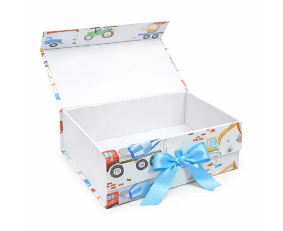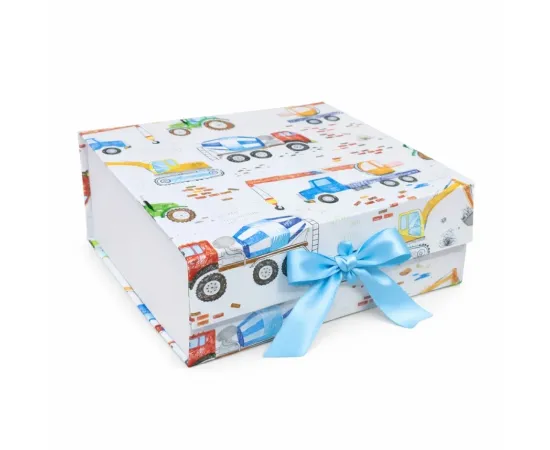 Această cutie cadou veselă, decorată cu ilustrații colorate cu vehicule și utilaje, este perfectă pentru a transforma orice cadou într-o surpriză plină de bucurie. Fundița satinată albastră adaugă un plus de farmec și face ca prezentarea să fie gata de oferit, fără ambalare suplimentară.