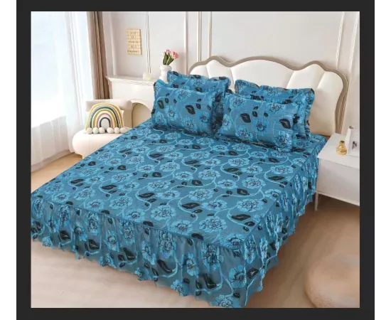 Cuvertură Pat Dublu, cu Volane, din Catifea, 3 Piese – 180x200 cm + 2 Fețe de Pernă, Albastru - LIM212