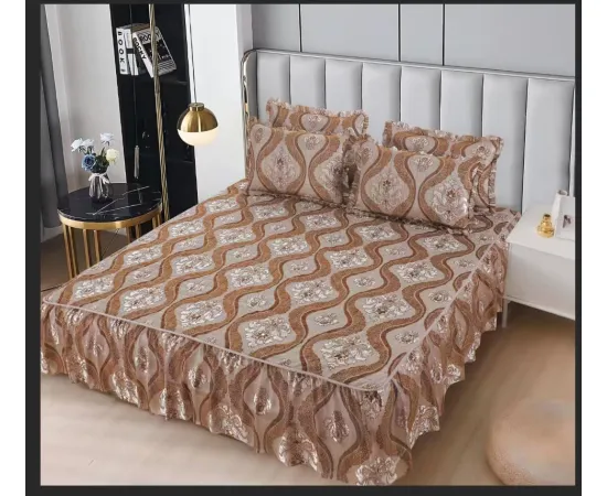 Cuvertură Pat Dublu, cu Volane, din Catifea, 3 Piese – 180x200 cm + 2 Fețe de Pernă, Bej - LIM217