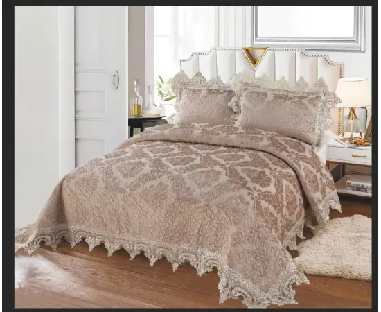 Adaugă eleganță și rafinament dormitorului tău cu această cuvertură pentru pat dublu din catifea, decorată cu dantelă premium și finisaje luxoase. Setul include o cuvertură generoasă de 230x250 cm și 2 fețe de pernă asortate, perfecte pentru un decor sofisticat și complet. Materialul moale și plăcut la atingere oferă confort și un aspect premium, iar modelul elegant cu broderii fine și margini din dantelă transformă acest set într-o alegere ideală pentru un dormitor modern și elegant