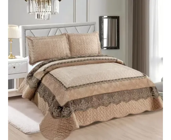 Cuvertură Pat Dublu, din Catifea cu Dantelă, 3 Piese – 230x250 cm + 2 Fețe de Pernă, Bej - LIM199