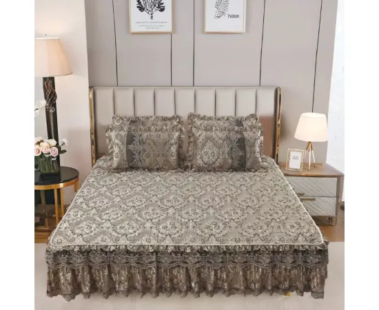 Cuvertură Pat Dublu, din Catifea cu Dantelă, 3 Piese – 230x250 cm + 2 Fețe de Pernă, Bej - LIM206