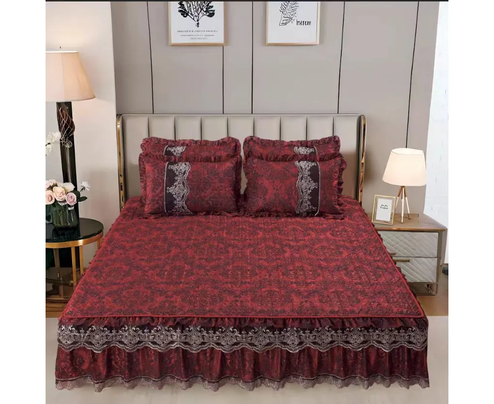 Cuvertură Pat Dublu, din Catifea cu Dantelă, 3 Piese – 230x250 cm + 2 Fețe de Pernă, Bordo - LIM202