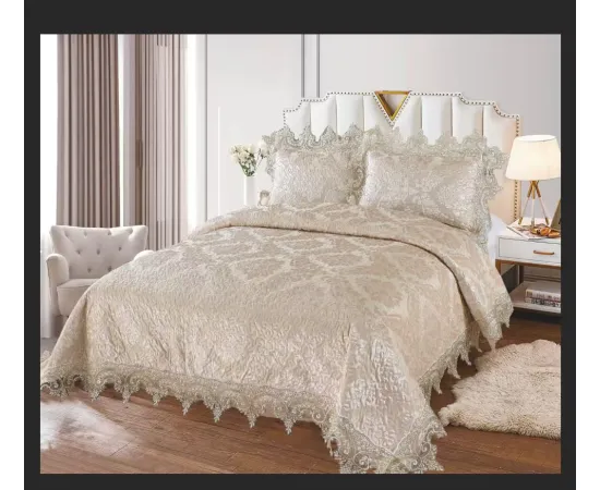 Adaugă eleganță și rafinament dormitorului tău cu această cuvertură pentru pat dublu din catifea, decorată cu dantelă premium și finisaje luxoase. Setul include o cuvertură generoasă de 230x250 cm și 2 fețe de pernă asortate, perfecte pentru un decor sofisticat și complet. Materialul moale și plăcut la atingere oferă confort și un aspect premium, iar modelul elegant cu broderii fine și margini din dantelă transformă acest set într-o alegere ideală pentru un dormitor modern și elegant
