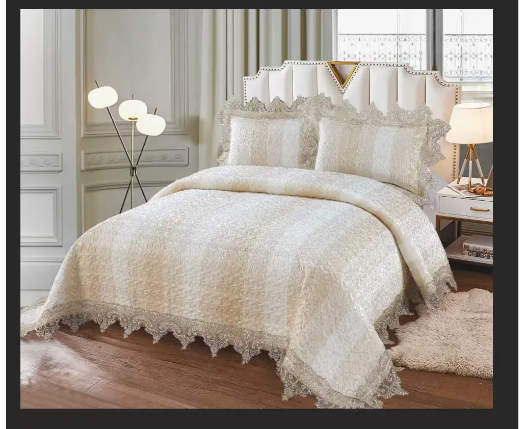 Adaugă eleganță și rafinament dormitorului tău cu această cuvertură pentru pat dublu din catifea, decorată cu dantelă premium și finisaje luxoase. Setul include o cuvertură generoasă de 230x250 cm și 2 fețe de pernă asortate, perfecte pentru un decor sofisticat și complet. Materialul moale și plăcut la atingere oferă confort și un aspect premium, iar modelul elegant cu broderii fine și margini din dantelă transformă acest set într-o alegere ideală pentru un dormitor modern și elegant