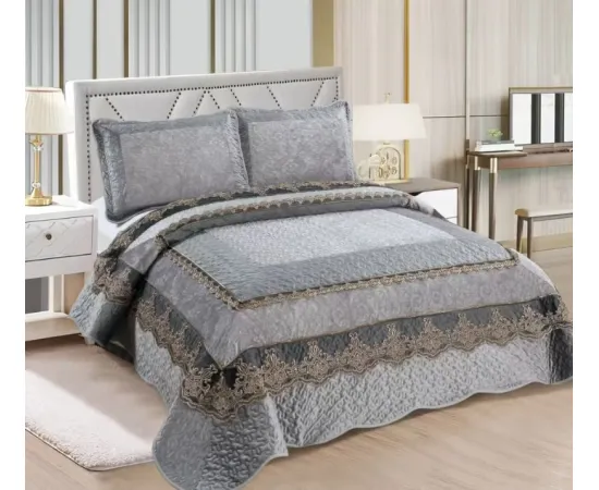 Cuvertură Pat Dublu, din Catifea cu Dantelă, 3 Piese – 230x250 cm + 2 Fețe de Pernă, Gri - LIM198