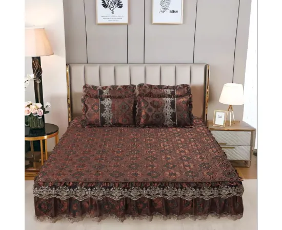 Cuvertură Pat Dublu, din Catifea cu Dantelă, 3 Piese – 230x250 cm + 2 Fețe de Pernă, Maro Inchis - LIM208