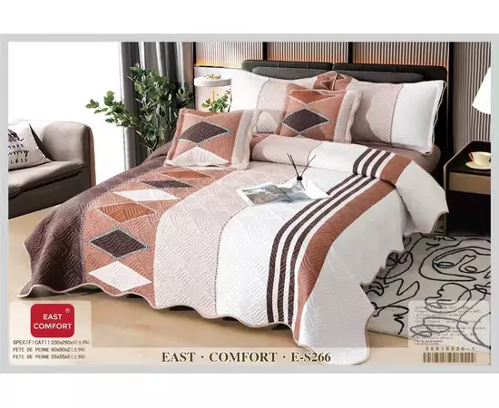 Cuvertura de pat matlasata, confectionata din bumbac tip tesatura finet.Imprimeul acestui set (cuvertura pat plus fete de perna) este realizat cu cele mai noi tehnologii - garantat nu se decoloreaza daca se respecta instructiunile de intretinere.