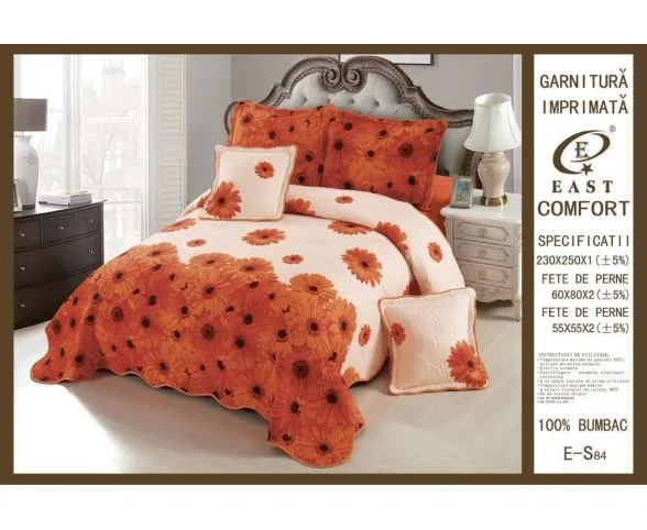 Cuvertura de pat matlasata, confectionata din bumbac tip tesatura finet.Imprimeul acestui set (cuvertura pat plus fete de perna) este realizat cu cele mai noi tehnologii - garantat nu se decoloreaza daca se respecta instructiunile de intretinere.