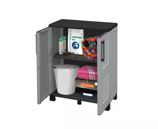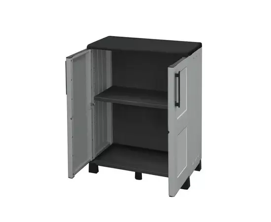 Dulapul produs din polipropilena prevazut cu doua usi si raft ajustabil, beneficiaza de design special pentru gradina, balcon, garaj sau atelier.