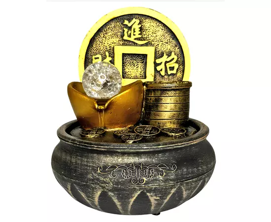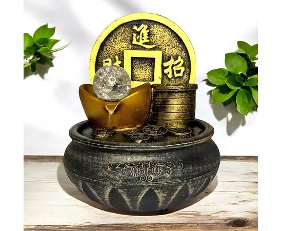 DESCRIERE Fântână decorativă cu moneda chinezească Descoperă cum elementele feng shui îți pot transforma spațiul într-unul plin de energie pozitivă și prosperitate. O fântână interior cu moneda chinezească, considerată amuleta pentru bani și prosperitate, poate aduce un sens de echilibru și succes în locuința ta. În feng shui, moneda norocoasă și apa activatoare a energiei banilor sunt obiecte integratoare ce pot deveni pilonii bunăstării tale financiare. Fântâna Interior cu monede norocoase O fântână interior cu monede chinezești și pepită nu este doar un element decorativ, ci este considerată un catalizator al fluxului de energie și abundență financiară. Plasată strategic în casa ta, în sectorul de Sud-Est, va activa colțul banilor. În feng shui, apa hrănește lemnul - element specific sectorului de prosperitate Sud Est.