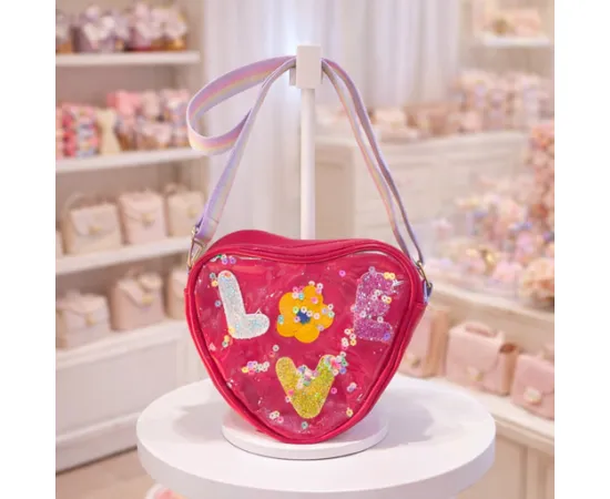 Colorată, jucăușă și plină de paiete, această geantă în formă de inimă este decorată cu literele sclipitoare „LOVE” și confetti libere între folii transparente, care se mișcă în interior. Ideală pentru cadouri sau pentru un plus de culoare în ținuta zilnică a celor mici.