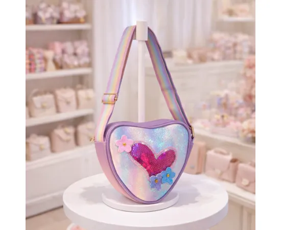 Această geantă adorabilă în formă de inimă este alegerea perfectă pentru micile fashioniste care adoră sclipiciul, culoarea și accesoriile jucăușe. Decorată cu inimioare din paiete reversibile și flori aplicate, fiecare geantă emană veselie și stil. Este prevăzută cu o curea reglabilă în culori curcubeu, pentru un plus de confort și versatilitate în purtare.