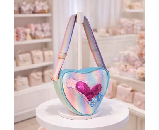 Această geantă adorabilă în formă de inimă este alegerea perfectă pentru micile fashioniste care adoră sclipiciul, culoarea și accesoriile jucăușe. Decorată cu inimioare din paiete reversibile și flori aplicate, fiecare geantă emană veselie și stil. Este prevăzută cu o curea reglabilă în culori curcubeu, pentru un plus de confort și versatilitate în purtare.