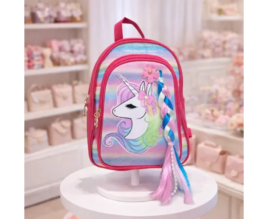 Un model adorabil de ghiozdănel creat special pentru fetițele care adoră culorile pastelate, sclipiciul și detaliile jucăușe. Designul frontal este accentuat de o figură cu coamă în valuri colorate și de o codiță împletită multicoloră, detașabilă, care adaugă un plus de magie și stil. Cu dimensiuni ideale pentru grădiniță sau plimbări, acest rucsac este alegerea perfectă pentru micile visătoare.