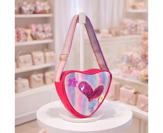 Această geantă adorabilă în formă de inimă este alegerea perfectă pentru micile fashioniste care adoră sclipiciul, culoarea și accesoriile jucăușe. Decorată cu inimioare din paiete reversibile și flori aplicate, fiecare geantă emană veselie și stil. Este prevăzută cu o curea reglabilă în culori curcubeu, pentru un plus de confort și versatilitate în purtare.