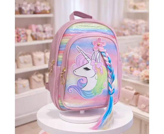 Un model adorabil de ghiozdănel creat special pentru fetițele care adoră culorile pastelate, sclipiciul și detaliile jucăușe. Designul frontal este accentuat de o figură cu coamă în valuri colorate și de o codiță împletită multicoloră, detașabilă, care adaugă un plus de magie și stil. Cu dimensiuni ideale pentru grădiniță sau plimbări, acest rucsac este alegerea perfectă pentru micile visătoare.