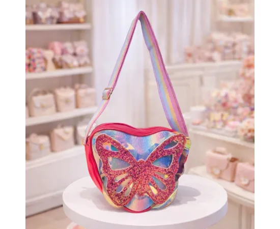 Această geantă adorabilă pentru fetițe îmbină designul strălucitor cu o formă delicată de inimă și un fluture 3D din glitter aplicat în față, devenind rapid accesoriul preferat al micuțelor. Curelușa reglabilă în nuanțe curcubeu permite purtarea confortabilă pe umăr, iar culorile pastelate cu efect sidefat adaugă un plus de magie oricărei ținute.