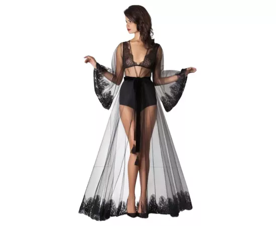Halatul de damă din voal și broderie, semi-transparent, cu cordon în talie, negru, este o piesă elegantă și rafinată, perfectă pentru momente de relaxare sau pentru a completa o ținută de interior cu un aer sofisticat.