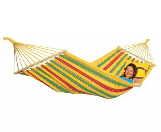 Hamacul confectionat din poliester si bumbac este rezistent la intemperii si raze UV si de asemenea, usor de transportat si depozitat.