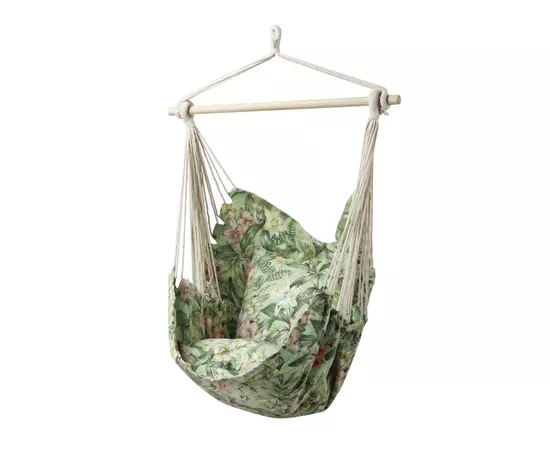 Hamacul tip scaun poate fi utilizat ca spatiu de relaxare atat in interiorul casei, cat si in gradina. Pernele pentru sezut si spate asigura confort si suport suplimentar, in timp ce bara de sustinere permite montarea si demontarea usoara a accestuia, fiind stabil si usor de rotit.