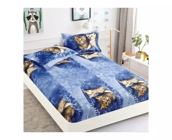 Husa de Pat + 2 Fete de Perna din Finet 180x200cm - JO818 Albastru cu Pisici