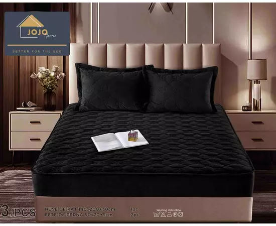 Husa pentru saltea tip topper cu elastic + 2 Fete de perna catifea, Negru - JO946