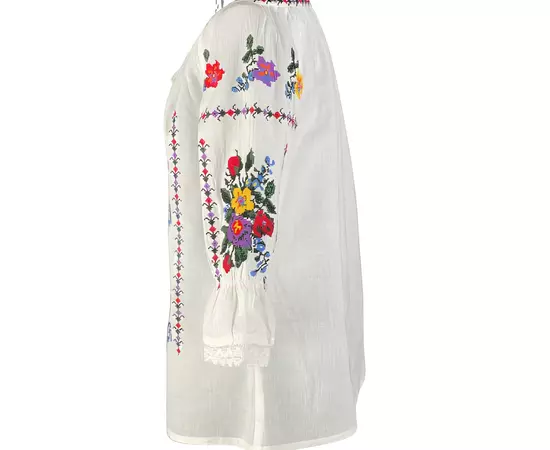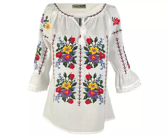 Ie traditionala alba din bumbac cu maneca 3/4 clopot si motiv traditional multicolor.
