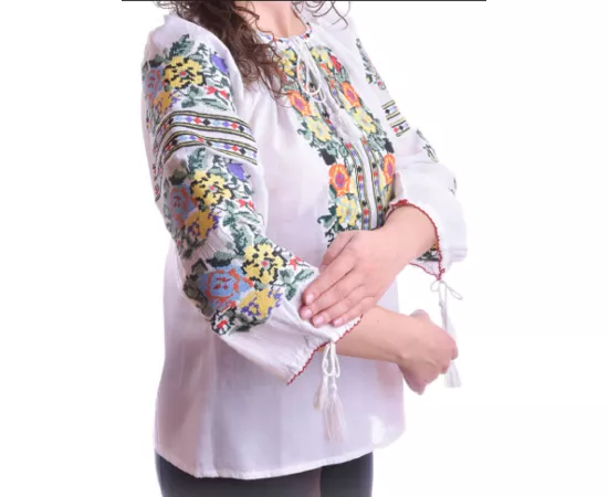 Ie Traditionala Alba cu Motiv Floral Multicolor de Dama - IMS30
