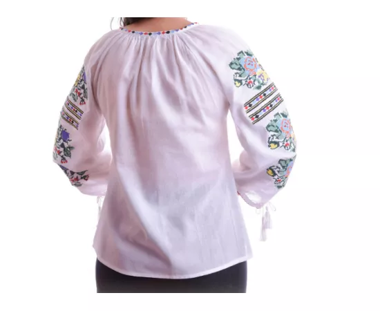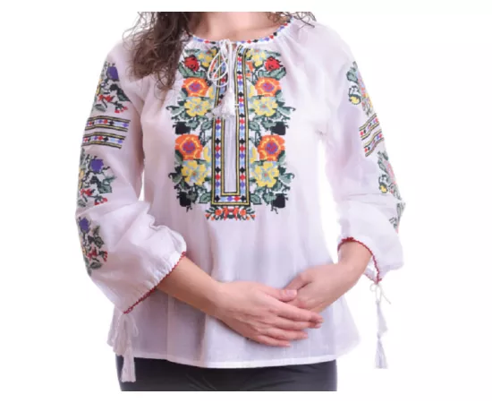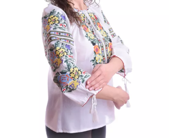 Ie Traditionala Alba cu Motiv Floral Multicolor de Dama - IMS30
