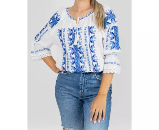 Ie Traditionala Alba cu Motiv Geometric Albastru de Dama - IMS05