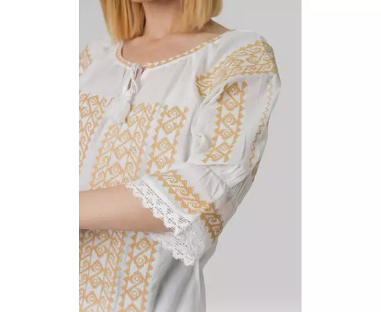 Ie traditionala alba din bumbac cu maneca 3/4 clopot si motiv traditional crem