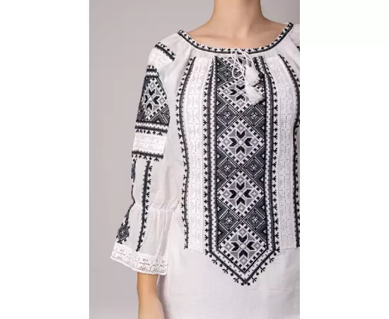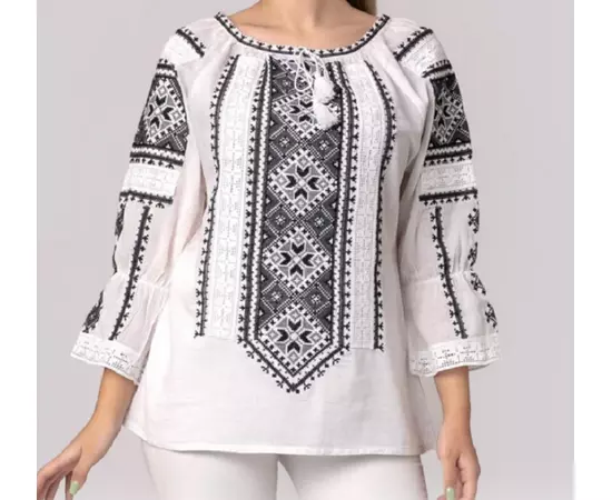 Ie traditionala alba din bumbac cu maneca 3/4 clopot si motiv traditional gri