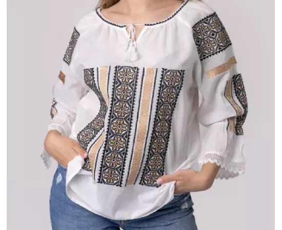 Ie Traditionala Alba cu Motiv Geometric Auriu de Dama - IMS07