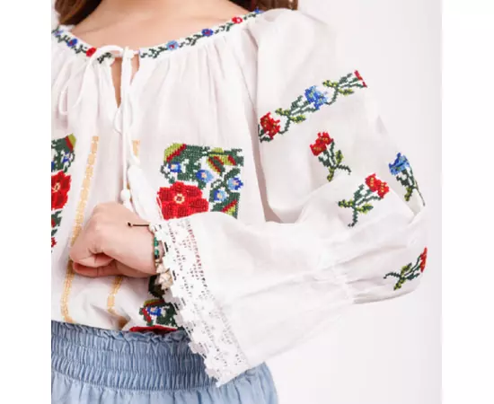 Recomandari ingrijire: Ie traditionala alba din bumbac cu maneca 3/4 clopot si motiv traditional multicolor
