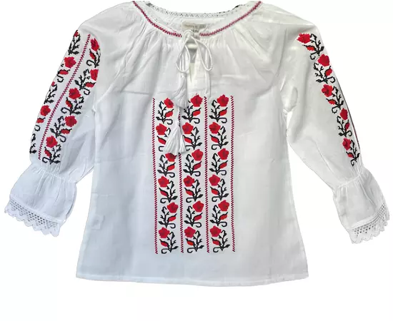 Ie traditionala alba pentru fetite cu motiv floral rosu - ITF21