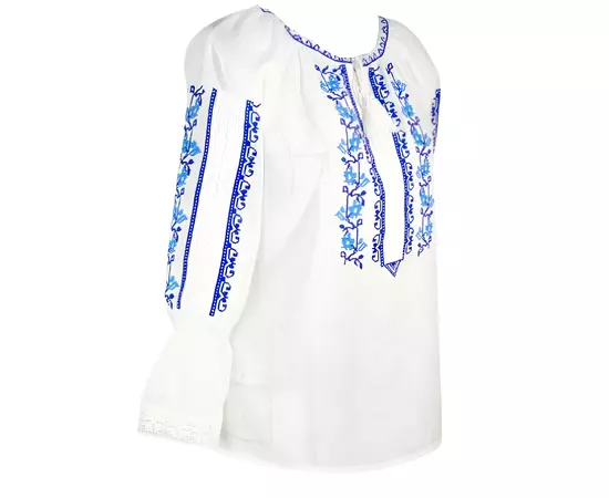 Ie traditionala alba din bumbac cu maneca 3/4 clopot si motiv traditional albastru