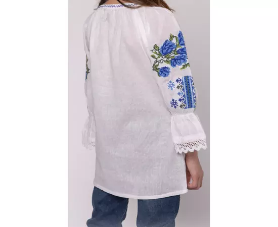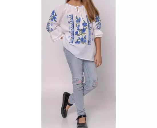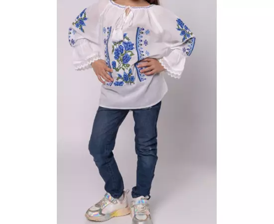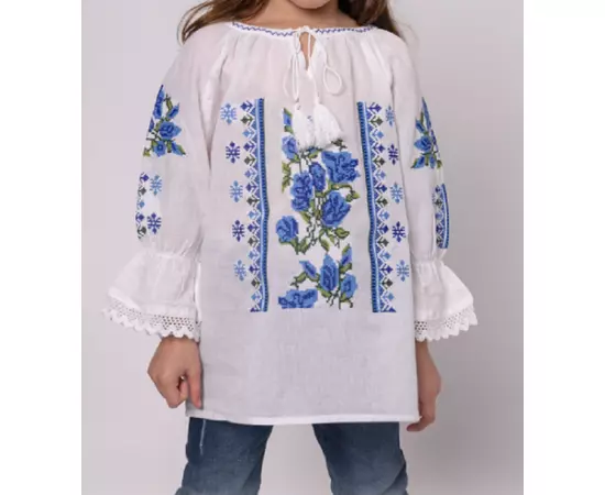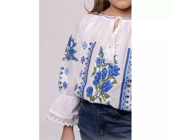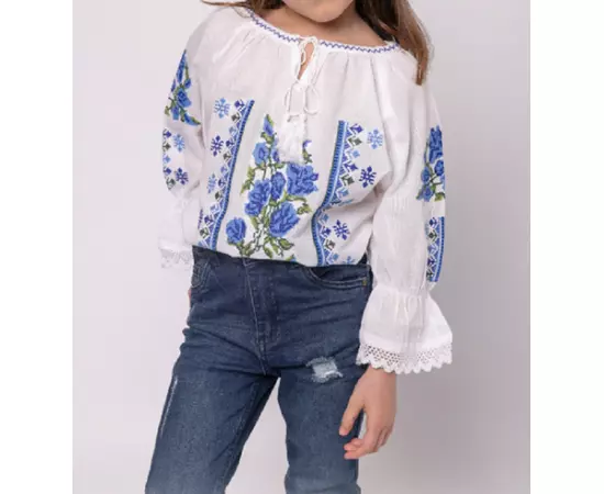 Ie Traditionala Alba pentru Fetite cu Motiv Floral Albastru - ITF17