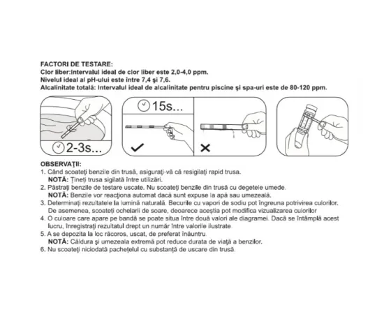 Utilizare: Se introduce o banda in apa piscinei pentru cateva secunde ( 2-3 sec ), se scoate se scutura putin de apa, se mai asteapta maxim 15 secunde si se citesc valorile analizate.