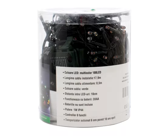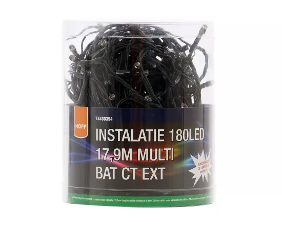Instalatia Hoff este prevazuta cu 180 LED-uri multicolore si functioneaza cu 3 baterii AA (se achizitioneaza separat). Cablul instalatiei are lungimea de 17.9 metri, iar cablul de alimentare are lungimea de 0.5 metri.