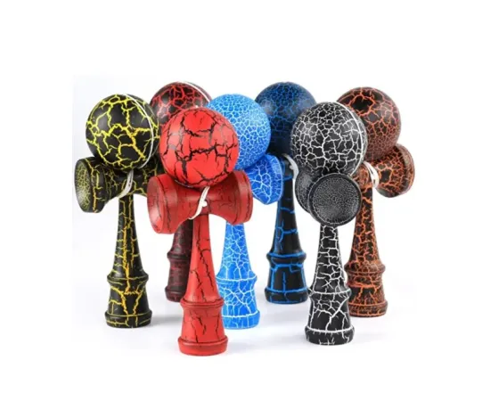 Kendama din lemn de 18 cm, disponibilă în culori vibrante cu efect crăpat, ideală pentru dezvoltarea coordonării, reflexelor și concentrării.